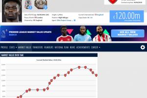 萨卡一年前还是生涯最高的1.5亿欧身价,随后接连下跌到1.4亿、1.3亿,以及最新的1.2亿。