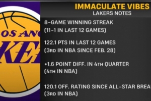 高歌猛进!湖人近12战场均轰122.1分 全明星后进攻效率高达120.1