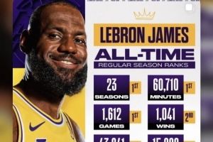 詹姆斯转发了NBA官方账号发布的他生涯各项数据纪录的历史排名,并评论道:“无比幸福!!!🙏🏾✨”