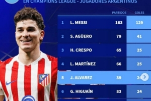 阿根廷球员欧冠进球榜:梅西129球居首,阿尔瓦雷斯24球升第五