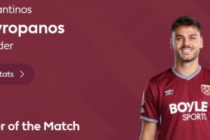 本场比赛西汉姆球员马夫罗帕诺斯打进一球,赛后当选英超官方球迷票选全场最佳球员。