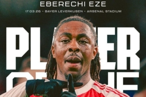 欧冠1/8决赛次回合,阿森纳2-0击败勒沃库森,两回合总比分3-1取胜晋级8强。次回合比赛,埃泽打入一记精彩的世界波破门,他也被球迷票选为阿森纳队内最佳球员。